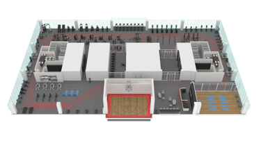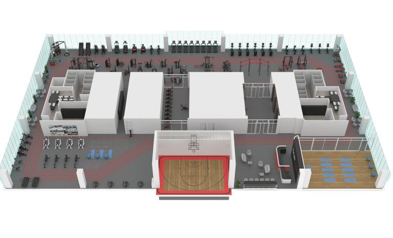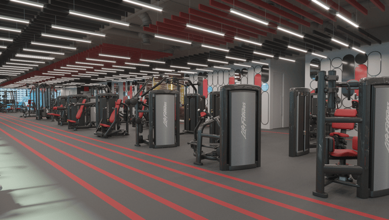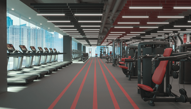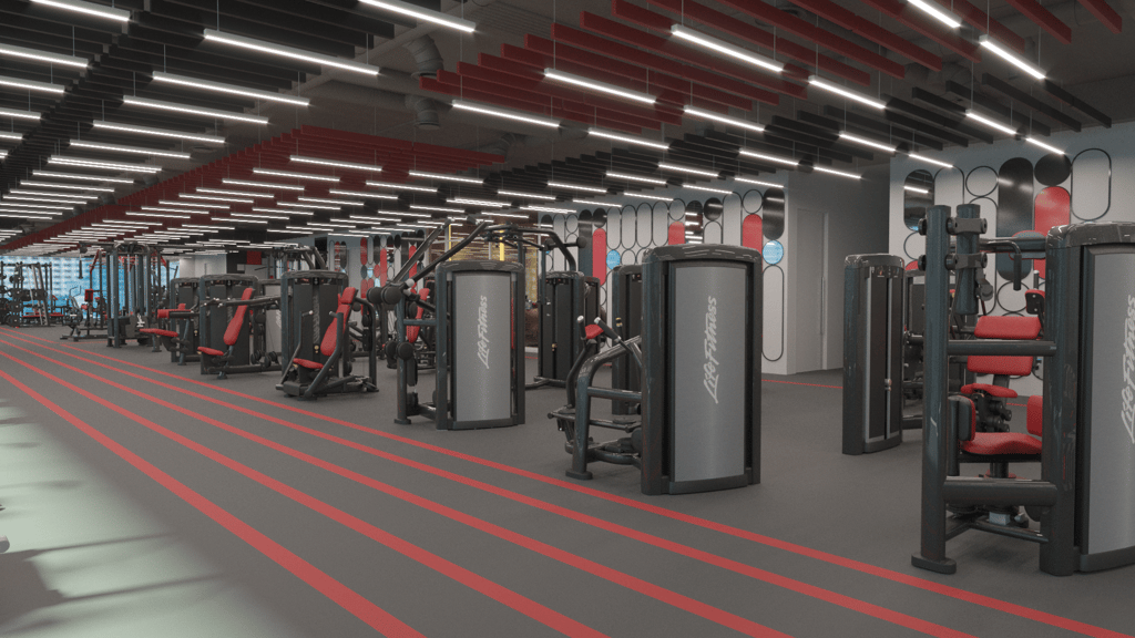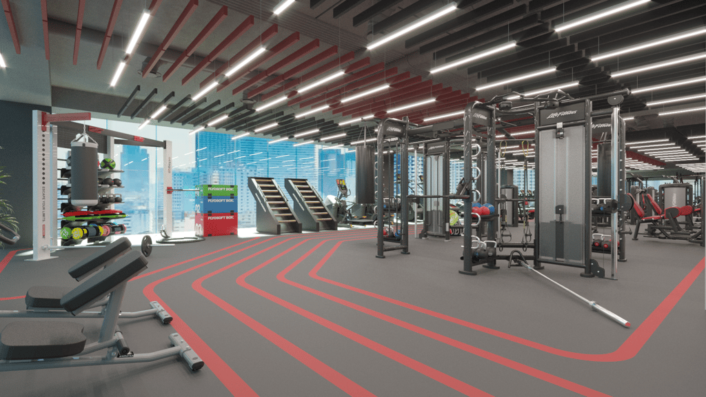 A corporate fitness facility designed for a modern workplace, reflecting the vision and identity of a leader in telecommunications and digital lifestyle services. The space promotes employee well-being as a foundation for productivity and a positive work environment.